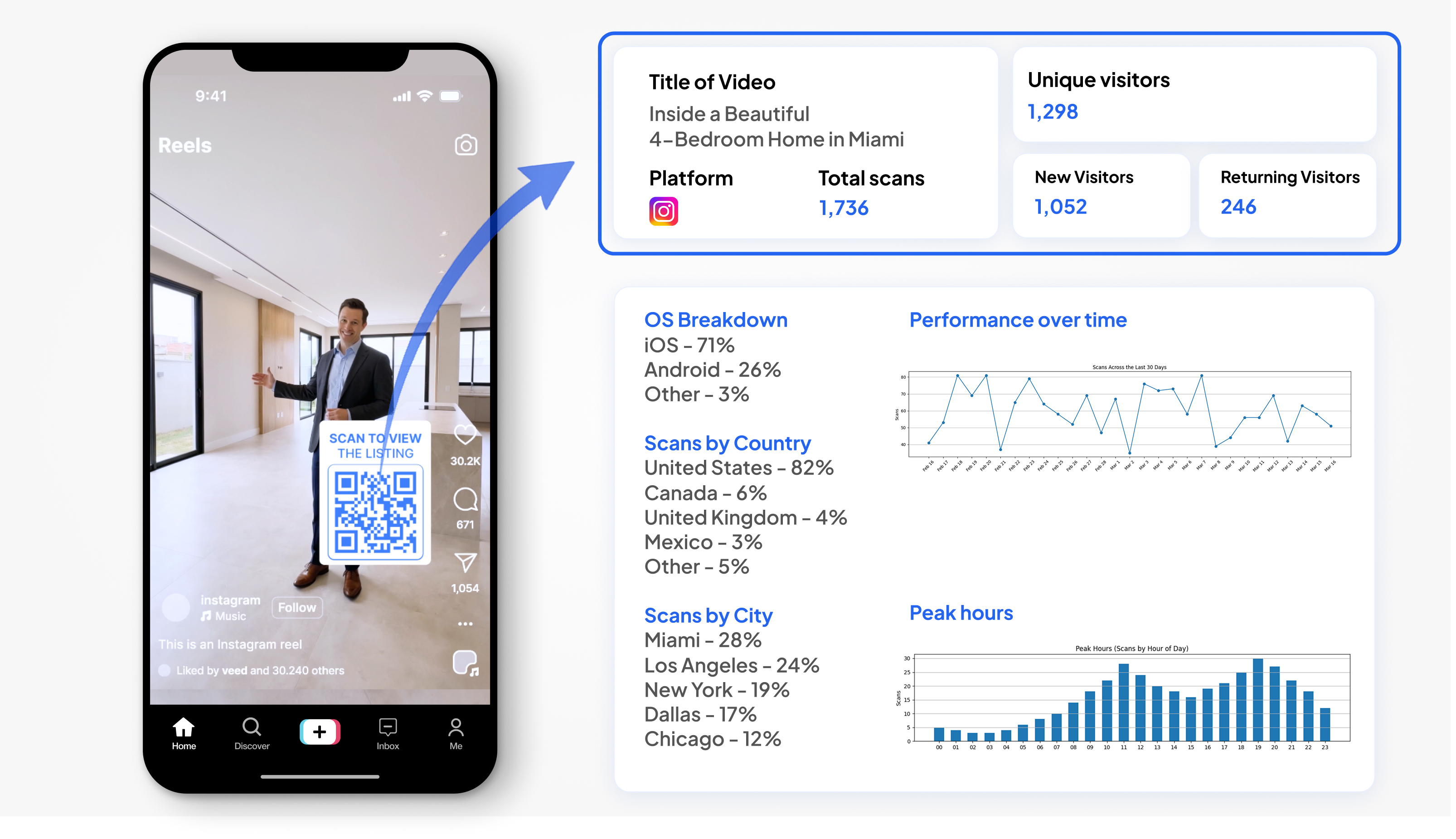 Track scan performance across videos, products, platforms, and campaigns. Discover which hooks, showcases, and QR placements drive the most engagement so you can repeat what works and scale consistent revenue growth.